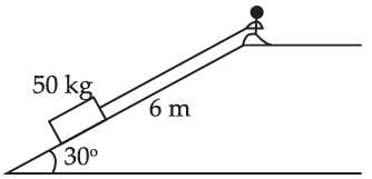 Câu 57 [758057]: Một mặt phẳng nghiêng nhẵn tạo với phương ngang một góc 30o như hình vẽ. Một người kéo một vật nặng 50 kg lên mặt phẳng nghiêng với vận tốc không đổi. Mặt phẳng nghiêng dài 6 m và vật được kéo từ chân mặt phẳng nghiêng lên đỉnh trong 30 s. Tìm công suất trung bình của người đó để kéo vật. Lấy gia tốc rơi tự do là 10 m/s2.