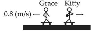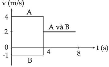 Sau đó, chúng va chạm trực diện không đàn hồi và dính vào nhau. Biểu đồ bên dưới cho thấy mối quan hệ vận tốc - thời gian của hai xe đẩy trước và sau va chạm (Bỏ qua thời gian va chạm và lực ma sát tác dụng lên các xe đẩy)
