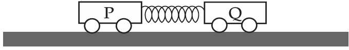 Trên một đường ray nằm ngang trơn nhẵn, hai xe đẩy P và Q được giữ đứng yên với một lò xo nén nhẹ ở giữa như thể hiện trong hình trên. Khối lượng của P và Q tương ứng là m và 2m. Khi các xe đẩy được thả ra và tách ra, xe đẩy Q chuyển động về bên phải với vận tốc v. Câu nào sau đây là đúng?