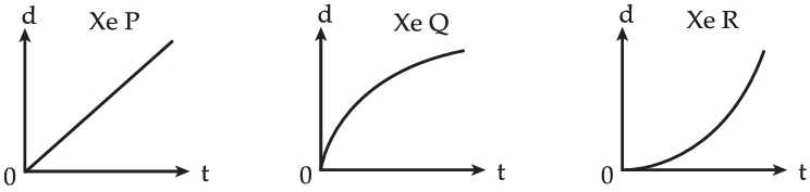 Ba chiếc xe P, Q và R chuyển động trên một đường thẳng nằm ngang. Đồ thị độ dịch chuyển theo thời gian của chúng được hiển thị ở trên. Chiếc xe nào trải qua sự thay đổi động lượng trong quá trình chuyển động?
