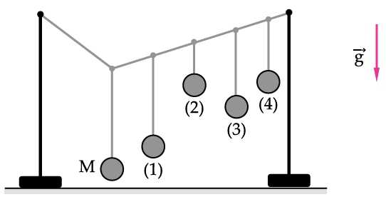 Câu 33 [759002]: Thực hiện thí nghiệm về dao động cưỡng bức như hình bên. Năm con lắc đơn: (1), (2), (3), (4) và M (con lắc điều khiển) được treo trên một sợi dây. Ban đầu hệ đang đứng yên ở vị trí cân bằng. Kích thích M dao động nhỏ trong mặt phẳng vuông góc với mặt phẳng hình vẽ thì các con lắc còn lại dao động theo.