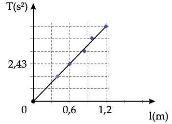 Câu 29 [759000]: Trong bài thực hành đo gia tốc trọng trường g bằng con lắc đơn, một nhóm học sinh tiến hành đo, xử lý số liệu và vẽ được đồ thị biểu diễn sự phụ thuộc của bình phương chu kì dao động điều hòa T2 theo chiều dài l của con lắc như hình bên. Lấy π = 3,14.
