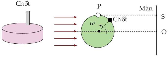 Câu 13 [758990]: Một cái chốt được gắn lên mép một cái đĩa bán kính r = 12 cm như hình vẽ. Đĩa quay với tốc độ góc không đổi ω = 4,7 rad/s. Một chùm tia sáng song song nằm ngang tạo ra bóng của cái chốt lên màn.