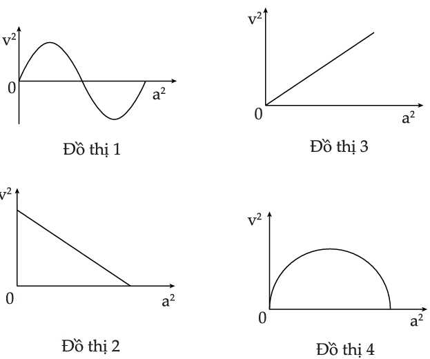 Câu 14 [758994]: Đồ thị nào sau đây biểu diễn đúng mối liên hệ giữa bình phương vận tốc và bình phương gia tốc của một dao động điều hòa?