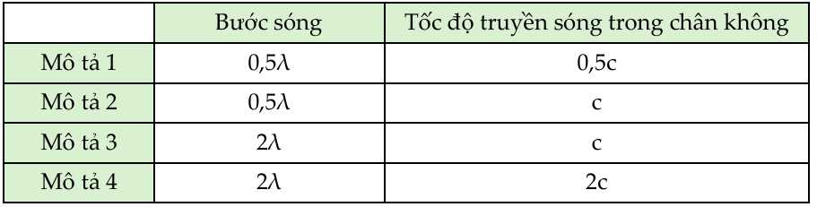 Câu 6 [758932]: Một sóng điện từ có bước sóng λ, tần số f lan truyền trong chân không với vận tốc c. Mô tả nào bên dưới là đúng cho bước sóng và vận tốc truyền của một sóng điện từ có tần số f/2?