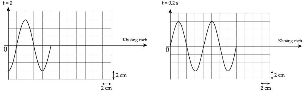 Đồ thị li độ dao động của các điểm dọc theo phương truyền sóng tại thời điểm t = 0 và t = 0,2 s được hiển thị bên dưới.