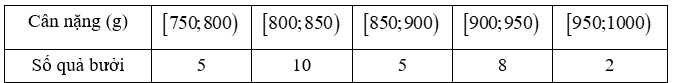 Câu 15 [715754]: Bảng sau thống kê cân nặng của 30 quả đu đủ được lựa chọn ngẫu nhiên sau khi thu hoạch ở vườn nhà Lan.