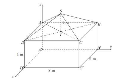 như hình vẽ nhờ một phần mềm đồ họa máy tính (đơn vị trên mỗi trục là mét). Biết rằng sàn nhà, bốn mặt bên là các hình chữ nhật, đỉnh