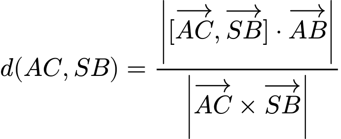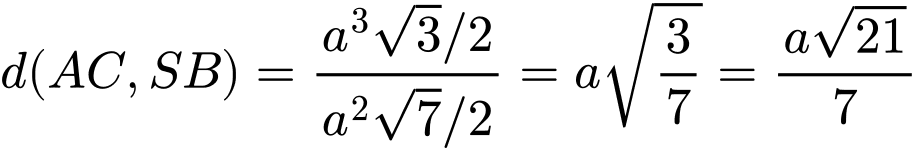 💡 Phương pháp: Phân tích hình học đáy để xác định độ dài các đường chéo và chiều cao hình chóp. Sau đó đặt hệ trục tọa độ phù hợp, xác định vectơ chỉ phương của hai đường thẳng chéo nhau và áp dụng công thức khoảng cách giữa hai đường thẳng chéo nhau bằng tích hỗn tạp vectơ.