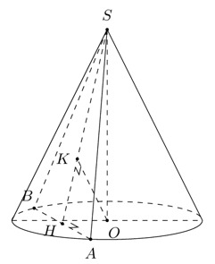 Dựng các đường vuông góc cần thiết để xác định khoảng cách từ điểm đến mặt phẳng, suy ra chiều cao khối nón rồi áp dụng công thức thể tích.