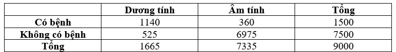 • Số người được thử là 9000, trong số đó có 1500 người đã bị nhiễm bệnh sốt xuất huyết và có 7500 người không bị nhiễm bệnh sốt xuất huyết.