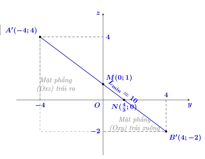 Điểm M di động trên tia Oz, điểm N di động trên tia Oy. Đường gấp khúc AMNB có độ dài nhỏ nhất bằng bao nhiêu (kết quả làm tròn đến hàng phần chục)?