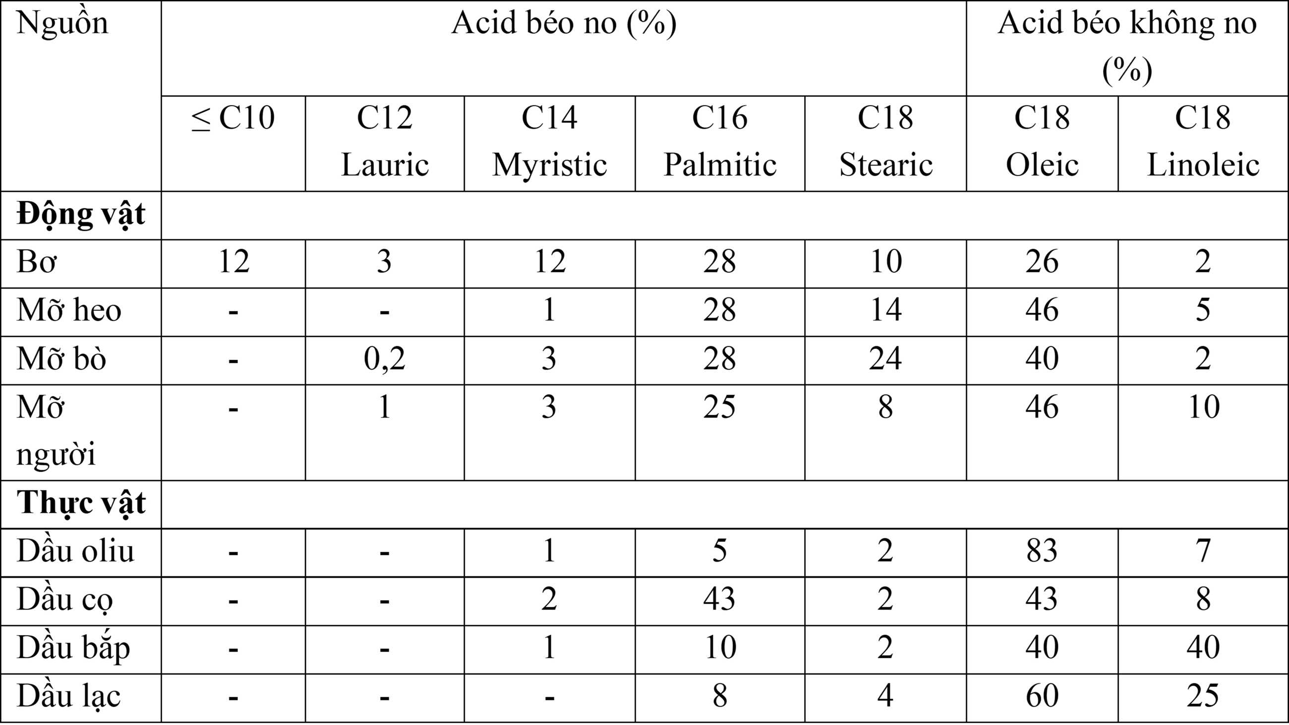 Chất béo động vật: thường chứa nhiều acid béo no hơn, ít acid béo không no hơn.