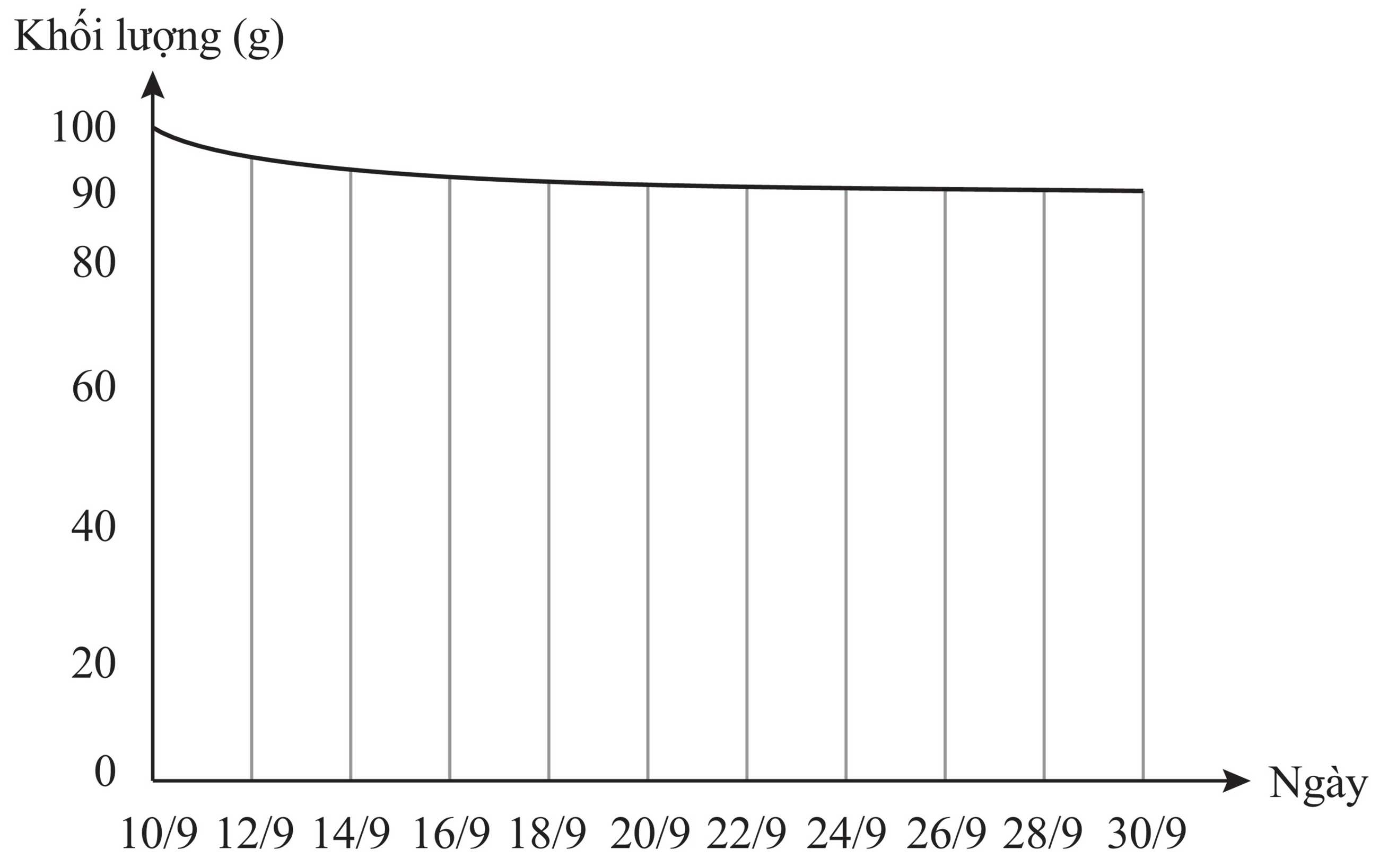 Câu 41 [1009574]: Một nhóm học sinh tiến hành thí nghiệm điều chế xà phòng từ nguyên liệu ban đầu là NaOH và mỡ lợn. Thành phẩm là những bánh xà phòng được nhóm bảo quản nơi thoáng mát, khối lượng ban đầu của mỗi bánh là 100 g. Để hoàn thành báo cáo kết quả thực hành, nhóm đã tiến hành cân khối lượng bánh xà phòng cứ hai ngày một lần và việc này thực hiện liên tục trong vòng 18 ngày, bắt đầu từ ngày tháo khuôn (Tùy khối lượng mẻ xà phòng điều chế, sớm nhất là sau 24 giờ sau khi đổ khuôn). Kết quả được thể hiện bởi biểu đồ quan hệ giữa cân nặng của bánh xà phòng theo thời gian như sau: