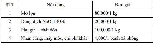 Sau khi tính toán lượng mỡ cần thiết, hòa trộn nguyên liệu với phụ gia, chất độn và dung dịch xút ở 32oC đến 35oC để thu được một hỗn hợp đồng nhất. Rót hỗn hợp vào khuôn sắt để phản ứng xà phòng hóa xảy ra. Giữ khuôn ở 30oC trong suốt quá trình phản ứng. Phản ứng sẽ kết thúc sau vài giờ, nhưng cần giữ xà phòng ở trong khuôn vài ngày cho sản phẩm đạt độ cứng cần thiết. Cuối cùng, cắt xà phòng thành từng bánh có khối lượng 100 gam/1 bánh, đóng nhãn và bao gói. Dưới đây là bảng giá nguyên liệu và các chi phí: