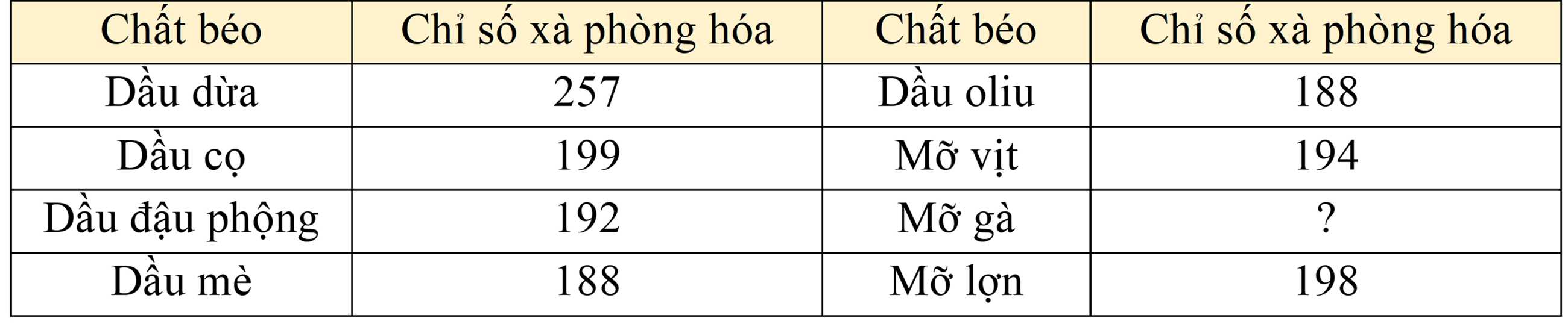 Câu 39 [1010353]: Cho chỉ số xà phòng hóa của một số chất béo như sau:
