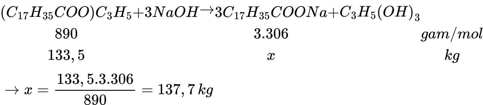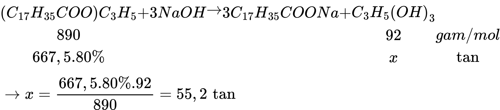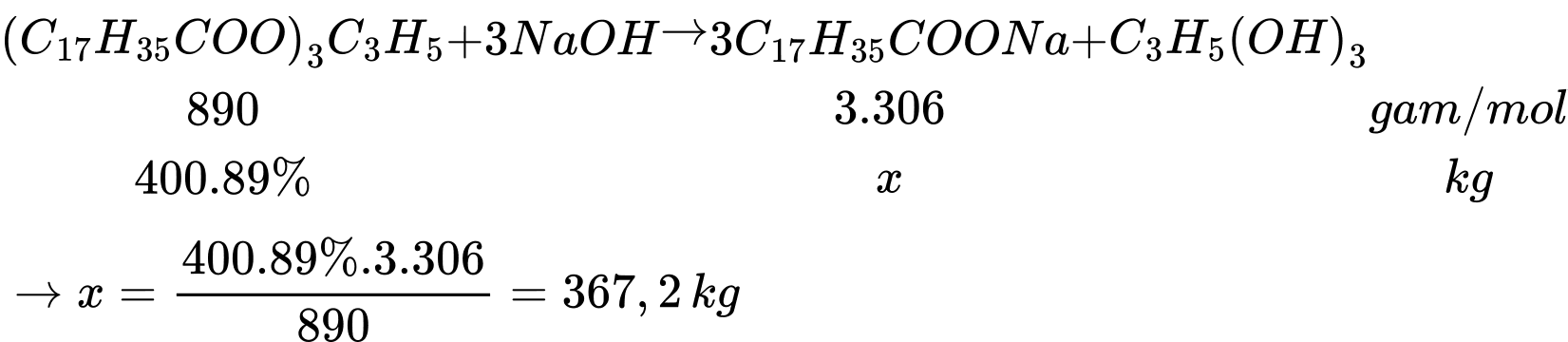 Giả sử hiệu suất phản ứng đạt 90% (đối với cả 3 loại triester) và khối lượng muối của acid béo trong xà phòng thành phẩm chiếm 75,5% về khối lượng, còn lại là chất phụ gia và chất độn.