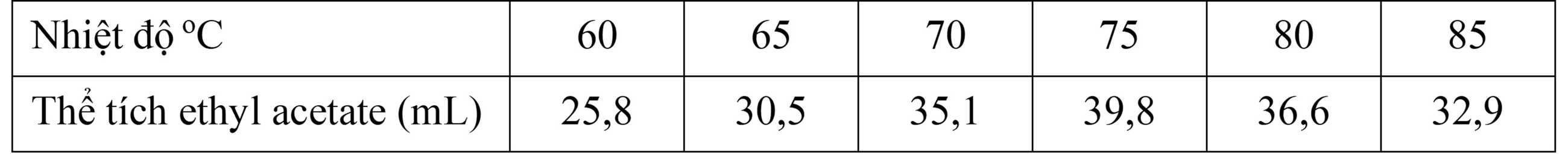 Lặp lại thí nghiệm trên, chỉ thay đổi nhiệt độ ở bước 2 lần lượt là 65; 70; 75; 80; 85. Nhóm học sinh ghi lại thể tích ethyl acetate thu được với thời gian thí nghiệm tương ứng và kết quả ở bảng: