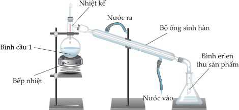 Câu 41 [1009531]: Một trong những phương pháp điều chế ester là đun hồi lưu hỗn hợp ethanol, acetic acid và H2SO4 đặc trong bình cầu 1 có chứa đá bọt trong một khoảng thời gian nhất định. Sau đó chưng cất để thu được ester ở nhiệt độ thích hợp như hình bên: