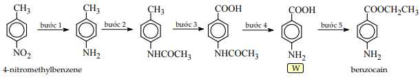 Câu 43 [1010334]: Benzocaine là một chất gây tê cục bộ thuộc nhóm ester, được sử dụng để giảm đau tại chỗ. Nó có thể được tổng hợp từ 4-nitromethylbenzene theo con đường được thể hiện trong hình dưới đây: