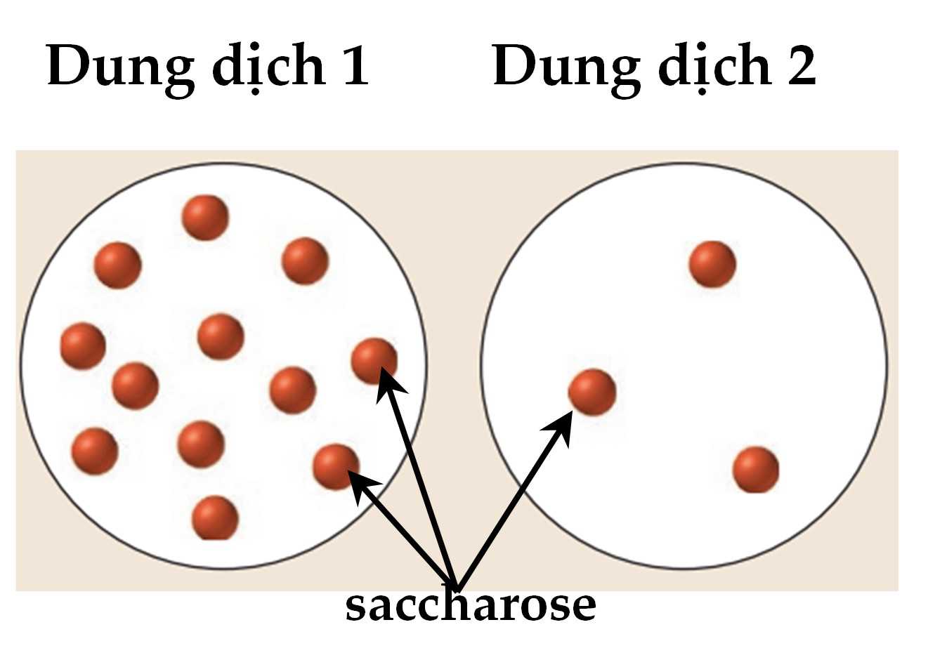 Dung dịch 1 chứa 12 hạt saccharose; dung dịch 2 chứa 3 hạt saccharose ⇒ tỉ lệ nồng độ saccharose dung dịch 1 gấp 4 lần dung dịch 2.