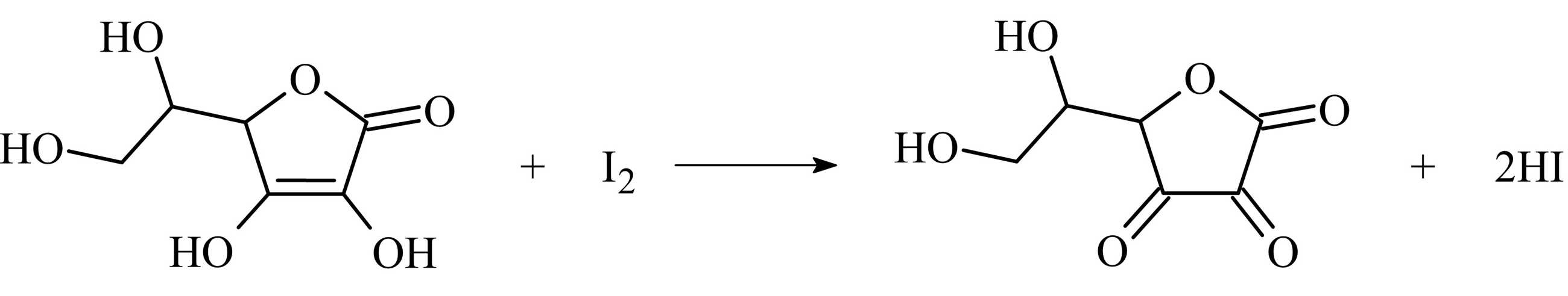 C6H8O6(aq) + I3−(aq) → C6H6O6(aq) + 3I−(aq) + 2H+(aq)