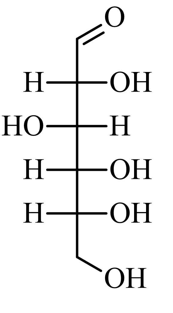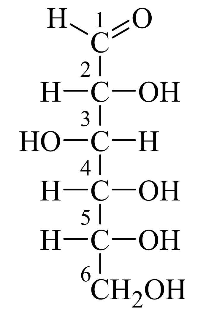 Thể hiện cấu trúc phân tử theo dạng thẳng với các nhóm OH ở bên trái/phải. Công thức chiếu Fischer của glucose thể hiện phân tử ở dạng mạch thẳng, với mạch carbon chính được viết theo chiều dọc và các nhóm OH, H được sắp xếp sang hai bên trái/phải. Đây không phải là dạng bền nhất của glucose trong dung dịch và cũng không phản ánh cấu trúc không gian thật sự của phân tử, nhưng giúp xác định cấu hình lập thể tại các carbon bất đối.