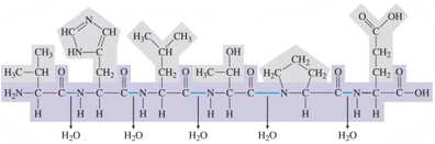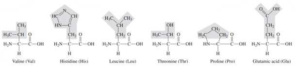 Valine (Val), histidine (His), leucine (Leu), threonine (Thr), proline (Pro) và glutamic acid (Glu) là 6 trong số 20 amino acid tạo nên protein của con người.