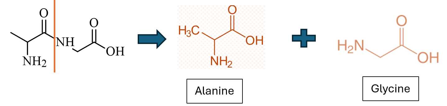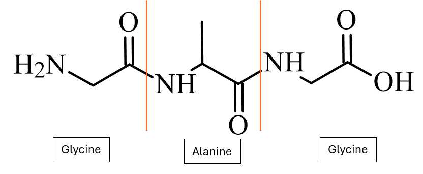 Từ phân cắt thấy 3 amino acid tạo thành peptide là Ala (CH3CH(NH2)COOH) - Gly (H2NCH2COOH) - Ala (CH3CH(NH2)COOH).