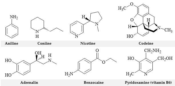 Hình bên dưới cho thấy cấu trúc của một số amine quan trọng về mặt công nghiệp và sinh học. Ví dụ, aniline là một amine thơm được sử dụng rộng rãi trong sản xuất thuốc nhuộm. Một số lượng lớn các amine có nguồn gốc từ nguyên liệu thực vật như rễ, lá và vỏ cây thường được gọi là alkaloid. Alkaloid tạo thành một nhóm hợp chất khổng lồ có đặc tính sinh lý đã được nghiên cứu chuyên sâu trong hơn 150 năm.