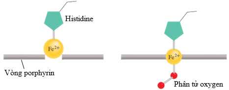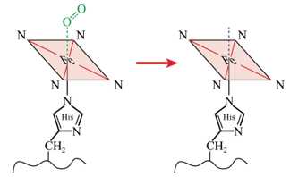 Trong phân tử hemoglobin chứa ion Fe2+. Người ta tin rằng ion Fe2+ có bán kính quá lớn để có thể lọt vào vòng porphyrin của phân tử deoxyhemoglobin. Tuy nhiên, khi O2 liên kết với Fe2+, ion sẽ co lại một chút để có thể vừa với mặt phẳng của vòng (Hình 25.15). Khi ion trượt vào vòng, nó kéo dư lượng histidine về phía vòng và do đó tạo ra một chuỗi thay đổi cấu trúc từ tiểu đơn vị này sang tiểu đơn vị khác.
