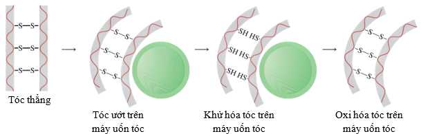 Trong đó các quả cầu màu đen đại diện cho các phân tử protein khác nhau được nối với nhau bằng liên kết disulfide và thioglycolate (HS–CH2COO−) là chất khử phổ biến. Sau đó, phần tóc được cắt gọn sẽ được quấn quanh dụng cụ uốn và tạo kiểu như mong muốn. Tiếp theo, tóc được xử lý bằng chất oxy hóa để cải tạo các liên kết disulfide. Bây giờ, các liên kết S–S đã hình thành ở những vị trí mới trên chuỗi polypeptide, kết quả là tạo ra một kiểu tóc gợn sóng như chúng ta mong muốn.
