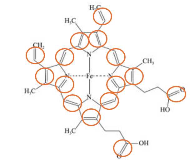 Từ công thức cấu tạo của heme, số liên kết π là 15.