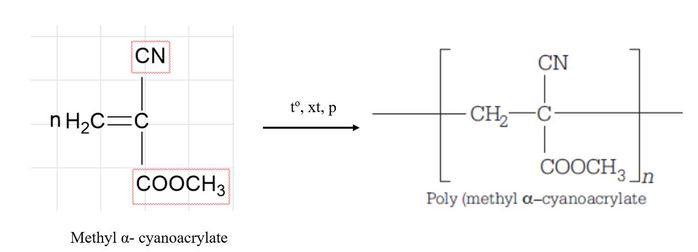Câu 45 [1010411]: [CTST - SBT] Keo dán 502 là keo dán thông dụng dùng để dán nhiều loại vật liệu khác nhau. Thành phần chính của loại keo dán này là một loại polymer có tên là poly(methyl α-cyanoacrylate) . Monomer để điều chế polymer này có công thức CH2=C(CN)COOCH3. Xác định công thức cấu tạo của polymer này.