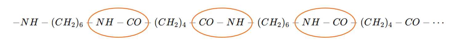 Cả hexamethylenediamine và adipic acid đều chứa sáu nguyên tử carbon, đó là lý do tại sao polymer thu được được gọi là nylon-6,6. Giống như protein, nylon-6,6 chứa các liên kết amide giữa các monomer, vì vậy nylon-6,6 cũng là một polyamide.