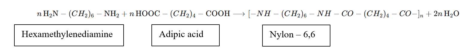 Nylon-6,6 là một polymer ngưng tụ tổng hợp được hình thành từ hexamethylenediamine, một phân tử có hai nhóm amino và adipic acid, một phân tử có hai nhóm carboxyl. Nước là phân tử nhỏ bị loại bỏ trong phản ứng ngưng tụ này.
