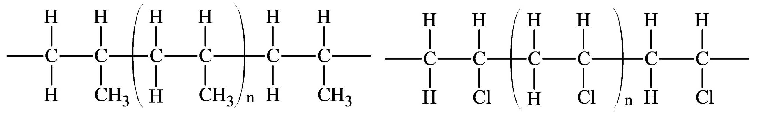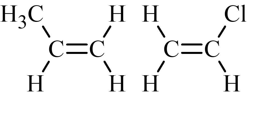Polypropylene được tổng hợp từ propene (C3H6) và poly(vinyl chloride) được tổng hợp từ vinyl chloride (C2H3Cl). Cấu trúc của các phân tử được hiển thị lần lượt như hình bên.