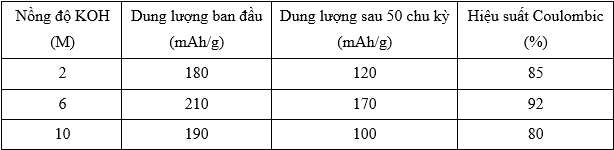✔️(a) – Đúng. Pin với KOH 6M có hiệu suất cao nhất (92%), dung lượng duy trì tốt sau 50 chu kỳ (giảm 40 mAh, so với mức giảm 60 và 90 mAh ở nồng độ 2M và 10M).