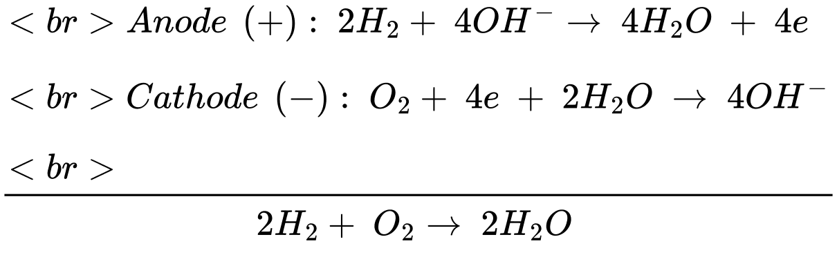 Cathode (+): 2H2 + 4OH– → 4H2O + 4e