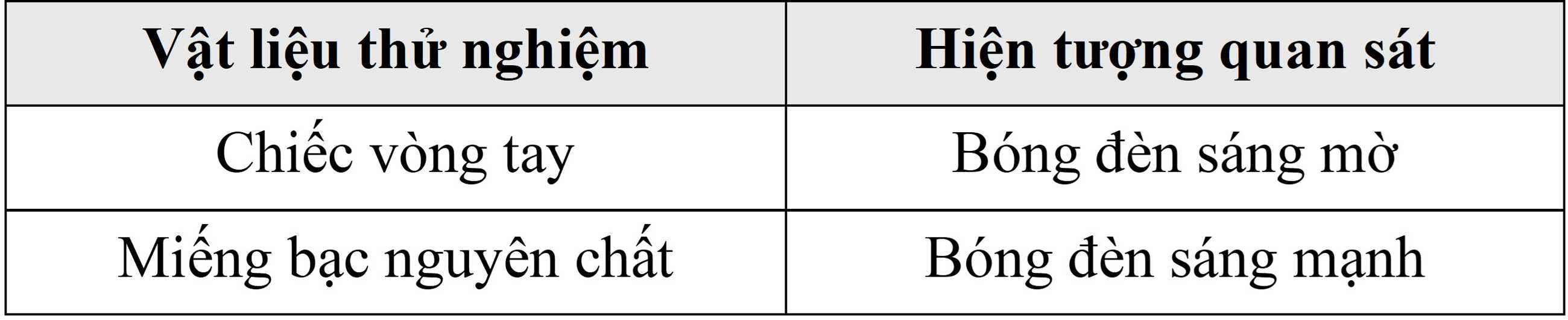 Thay lần lượt chiếc vòng tay và miếng bạc nguyên chất vào vị trí của kim loại thử nghiệm, so sánh độ sáng của bóng đèn giữa các lần thử. Kết quả thí nghiệm được cho trong bảng: