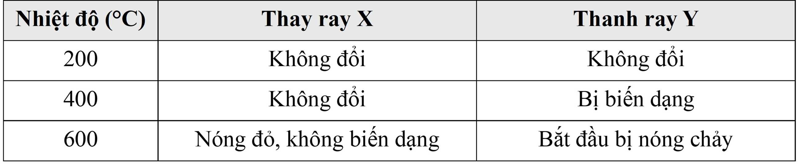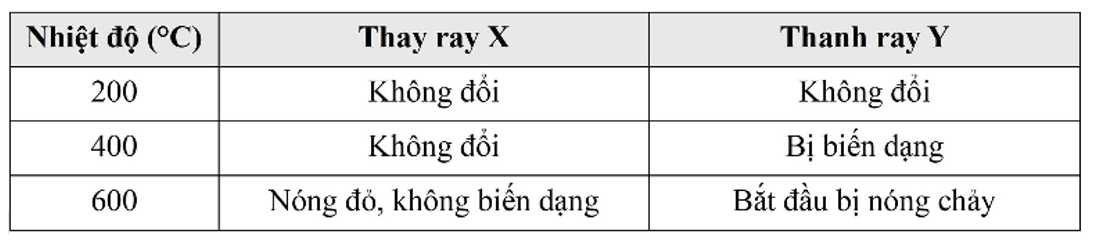 Từ bảng số liệu ta có thể thấy rằng X có nhiệt độ nóng chảy cao hơn Y với nguyên do, thanh X bị nóng đỏ khi đến 600oC, còn thanh Y khi đến 400oC đã bị biến dạng và bắt đầu bị nóng chảy khi đặt đến 600oC.