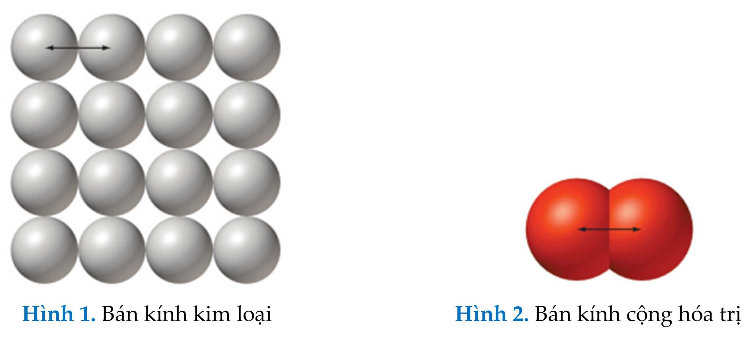 Có hai cách xác định bán kính nguyên tử. Một là bán kính kim loại, bằng một nửa khoảng cách giữa hạt nhân của hai nguyên tử kim loại giống hệt nhau và liền kề với nhau hình 1. Cái còn lại là bán kính cộng hóa trị, bằng một nửa khoảng cách giữa các hạt nhân giống hệt nhau, liền kề nhau trong một phân tử hình 2.
