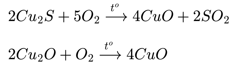 Cu2S hoặc sản phẩm Cu2O bị oxy hóa sâu hơn để tạo thành copper(II) oxide (CuO):