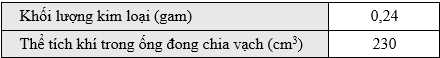 Giả sử 1 mol hydrogen có thể tích là 24,0 dm3 trong điều kiện thực nghiệm. Kết quả được ghi lại trong bảng sau: