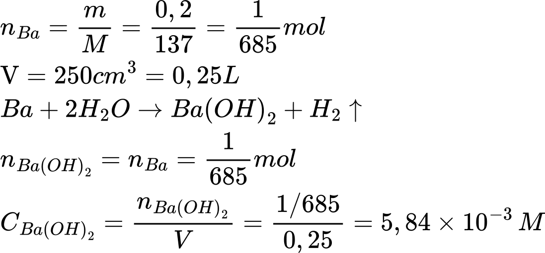 Câu 36 [560948]: Barium tham gia phản ứng mãnh liệt với nước ở nhiệt độ thường. Tiến hành cho 0,20 gam barium phản ứng với 250 cm3 nước. Biết nồng độ mol (mol/L) của dung dịch thu được là a x 10-3, coi thể tích dung dịch không đổi. Giá trị của a là bao nhiêu?