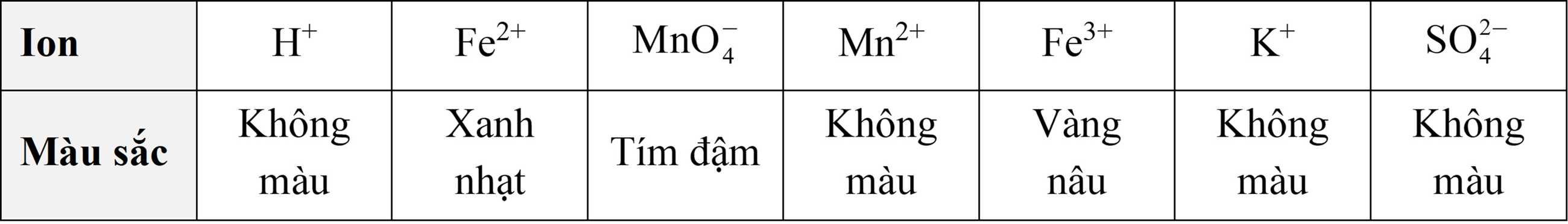 + H+ ,K+ ,SO42− : không màu ⟹ Không còn Fe2+ (màu xanh nhạt) và không còn MnO4- (màu tím đậm)