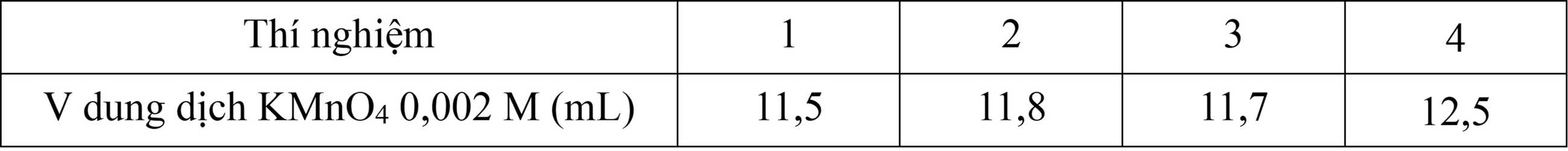 Lặp lại thí nghiệm trên thêm 2 lần, kết quả ghi nhận được thể tích dung dịch KMnO4 0,002 M là