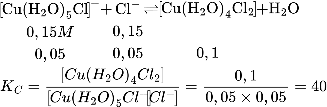 Người ta thấy rằng đối với phản ứng này, với nồng độ đầu của phức chất [(Cu(H2O)5Cl]+ là 0,15 M và HCl là 0,15 M thì tại thời điểm cân bằng, nồng độ của phức Cu(H2O)4Cl2(aq) là 0,10 M.