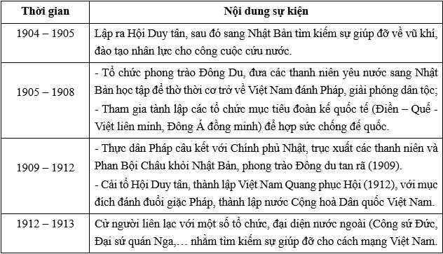Câu 15 [875693]: Cho bảng thông tin về hoạt động đối ngoại của Phan Bội Châu sau đây: