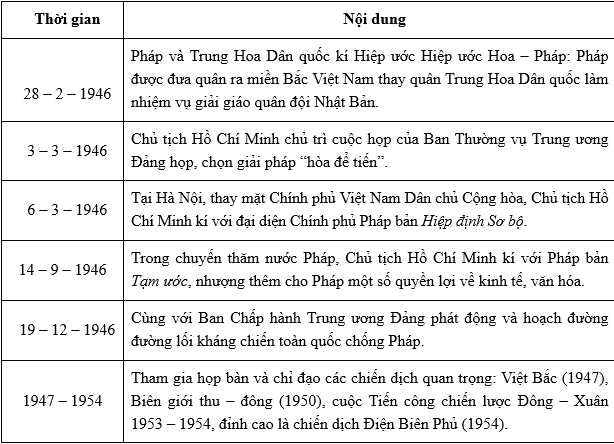 Câu 11 [1053508]: Trong việc giải quyết mối quan hệ Việt – Pháp (từ đầu tháng 3 đến trước ngày 19-12-1946), Chủ tịch Hồ Chí Minh và Ban Thường vụ Trung ương Đảng đã